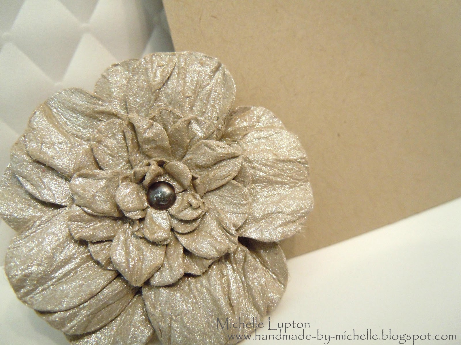 I love the effect I got from making this flower out of Crumb Cake (aka Kraft) cardstock, then misting with Perfect Pearls - the photo below shows the difference between the plain Crumb Cake and the misted flower.